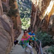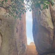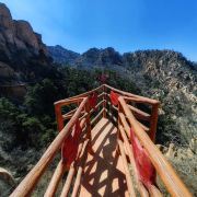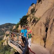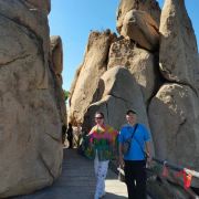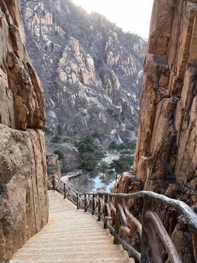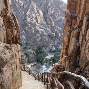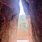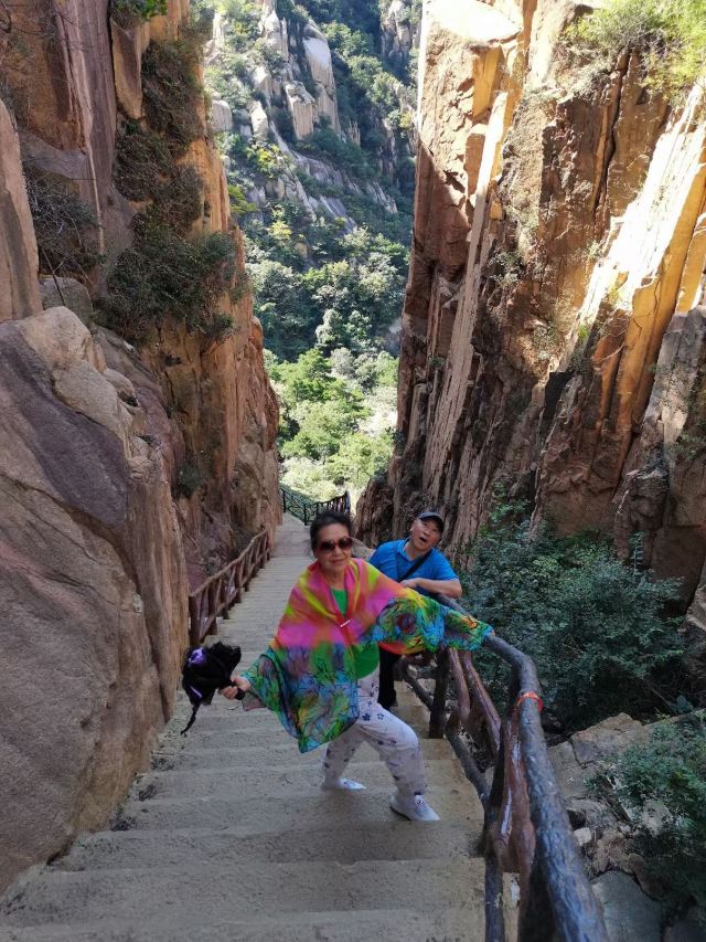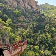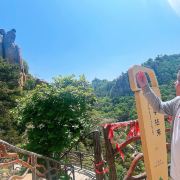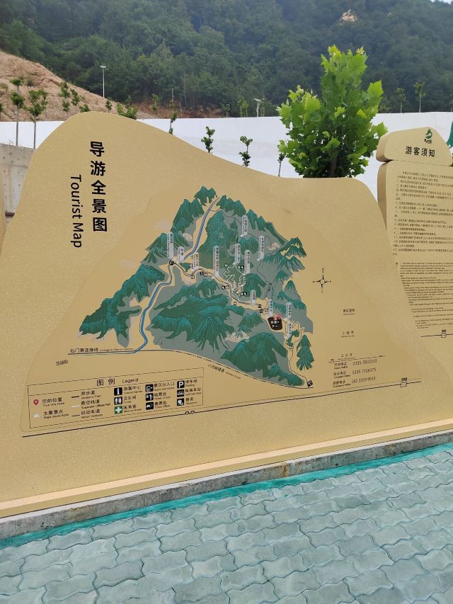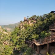精华景色在山中栈道区。转一圈后出山有两个方向,要么继续爬栈道回到检票口,要么走下一段挺陡的台阶到谷底,再走到一片儿童游乐区,坐所谓景交车送回到售票口停车场。但售票口和游览路线推荐都语焉不详,买了照片里的套票是坐不了景交车的,要再掏20块一人。可能是因为没有游客吧,站点里并没有车,得走出好远到村里了才找到管理人员叫车来接。早知一样费体力不如爬山返回了,起码还有景色看。