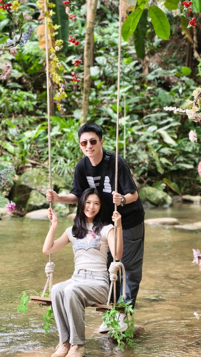 天梯栈道上线20分钟,就到天池了,瀑布的源头有两级小瀑布拍照也非常出片,沿龙溪谷前行到秋千位置打卡拍照,在热带雨林的溪水旁,凉风兮兮,流水潺潺,荡秋千真的是非常惬意。从这里右手边上去可以乘坐观光车去天琴树和树梢栈道,还有雨林速滑!