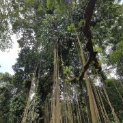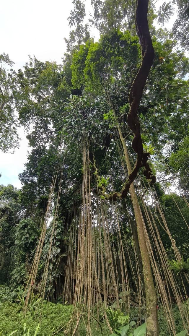 还有另一个让我们十分震撼的景点,天琴古树。三十多米高的大树,垂着数不清的气根——“黄金索”树干似琴身,藤条似琴弦,犹如一把竖琴,十分壮观。