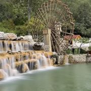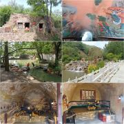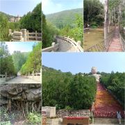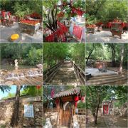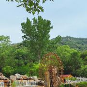 5、我从主山路下山,没走回头路,顺着潺潺溪水途径“佛光普照”(用塑料花铺的路,正对着大佛,但游客不能走)、“礼佛台”(一个祭祀平台,铜鼎上插着密密麻麻未点燃的香。因为园区禁烟,大佛脚下也没有香只有贡品)、“园子沟”(旁边是宿营营地,分免费区和收费区)、“蒙山氧吧”(小溪两岸是参天针叶林景观,夏天很阴凉,氧气含量很高)、“蒙山晓月”(水车、碧水、假山、小瀑布构成一副绝美的山水田园景观,颜值高必拍照打卡)、“寺底古窑洞”(一座完整的石头窑洞,用蜡像还原了窑洞内部的陈设)。还有吊桥、弹琴像(旁边放着古筝曲很应景儿)等情趣小景观。