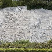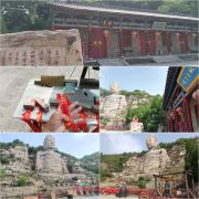 2、下车处可租讲解,也有免费讲解二维码。上山途径“造佛盛景”浮雕(呈现了北齐开凿大佛时“一夜燃油万盆”的盛大场景)和“御驾桥”(历代皇帝来拜大佛时走的石拱桥)后到达“观音堂”(不开放)旁的餐饮区,这里拱形桥洞的通路两侧贴有“窑洞”和“蒙山”文化简介。