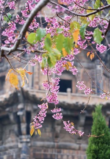 中轴线之上,大雄宝殿庄严肃穆,又称“紫云大殿”“百柱殿”,100根样式丰富的柱子支撑起这座宏伟的建筑,殿内五座佛像慈悲庄严,令人心生敬畏。而殿内部分柱子上雕刻的古印度教大神克里希那的故事和花卉图案,更是体现了多元文化在此交融的独特魅力。