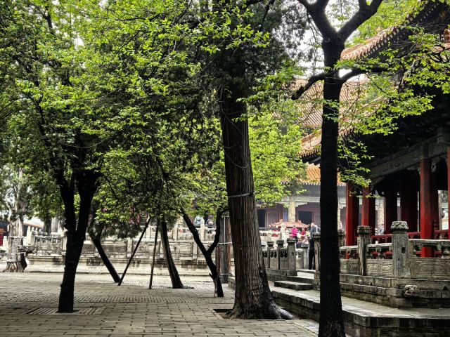 接着会依次穿过孔庙-圣时门、孔庙-弘道门、大中门、同文门,各道门之间都是草木葱郁的院落。其中,大中门左右两边靠墙角处各有一座角楼,而同文门左右两侧各有两座大石碑,这是有名的四大明代御碑。