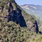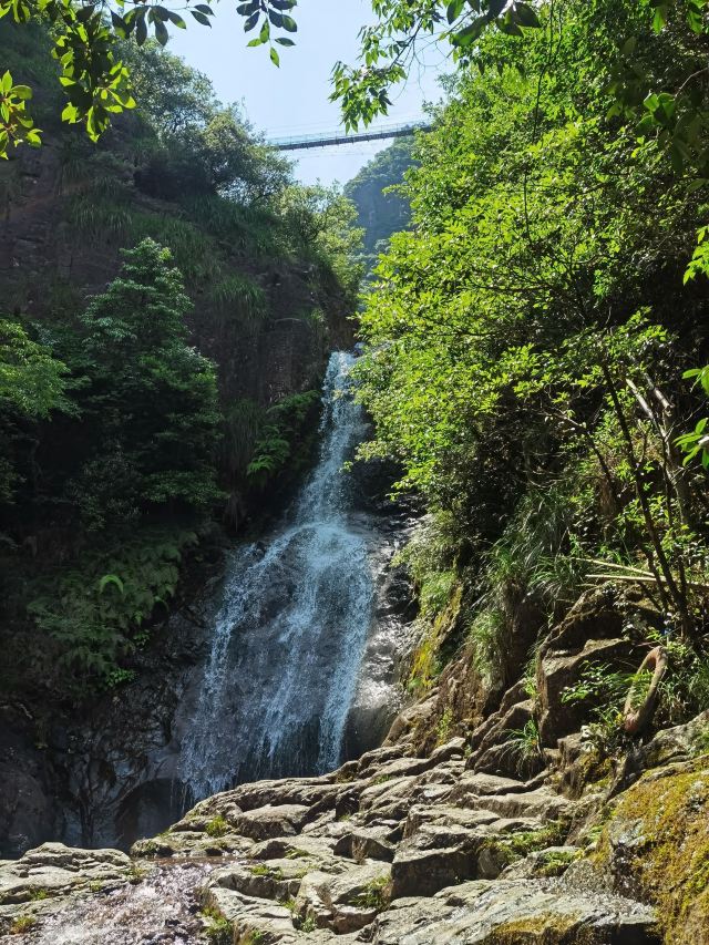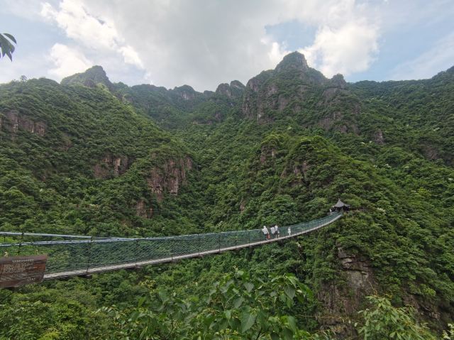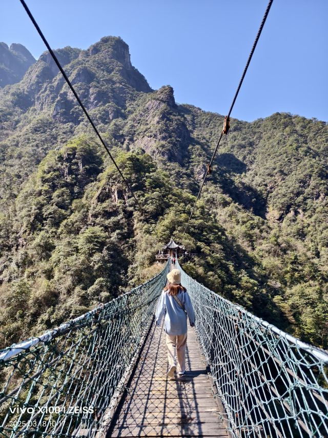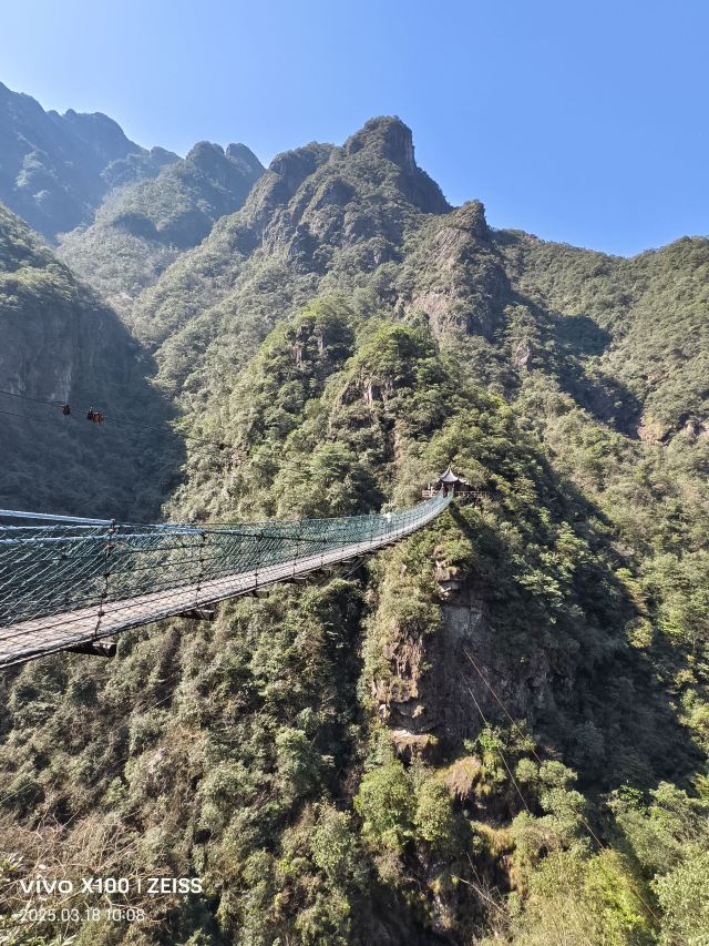 飞龙索桥被誉为 “浙西第一索桥”,离地高100多米,长度为108米,由19根钢索连接,以坚固的枕木为底基,上面铺着厚实的木板,坚固且壮观。走上这条连接两座山的“一线天”,可以360度观赏整座峡谷全貌,视野开阔,矗立于云海之巅。