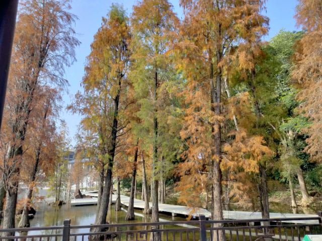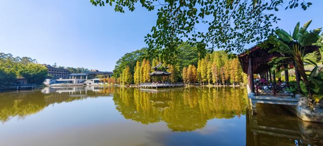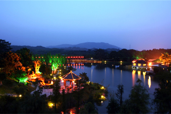 山庄内一派湖光山色,成片的珍稀水杉四季色变,春夏绿叶如羽,秋来金黄醉人,听涛湖、千竹湖等水域环绕其中,环境清新怡人。浪漫唯美的摩天轮、刺激的滑草场给人带来众多欢乐,农具作坊、农乐园等设施则是体验农耕文化的好去处。别墅酒店更是给人宾至如归的度假体验。