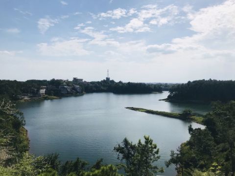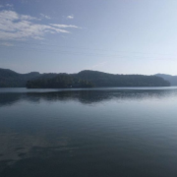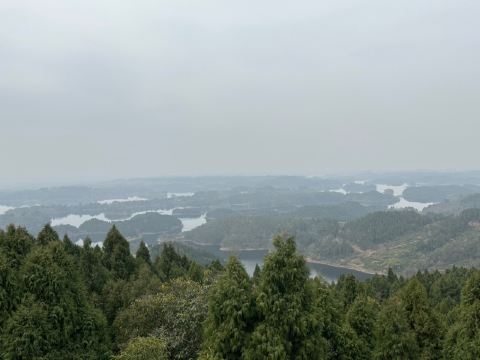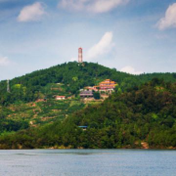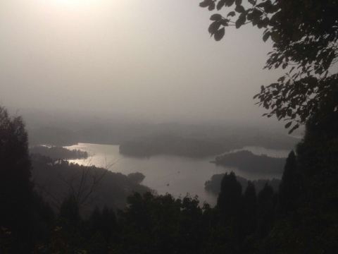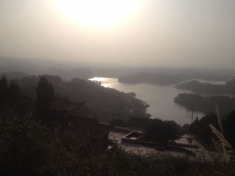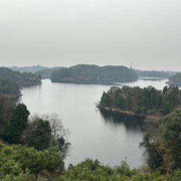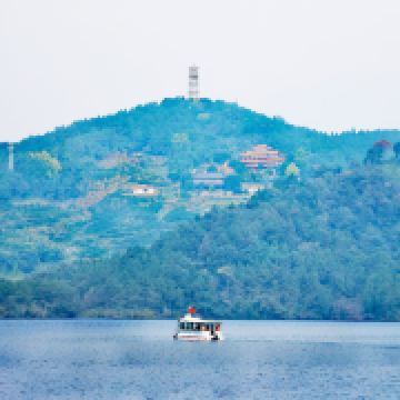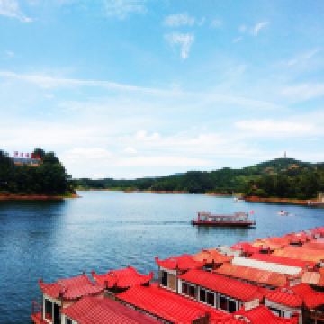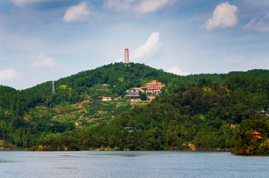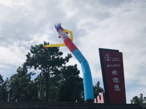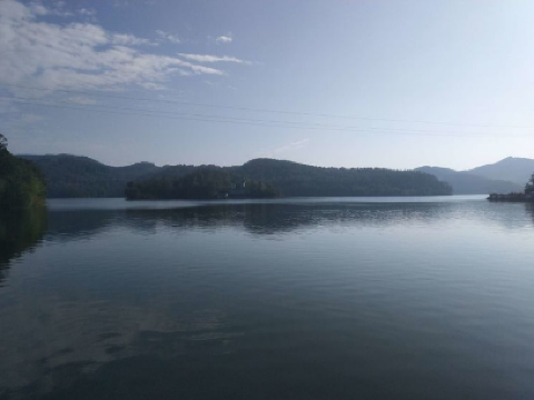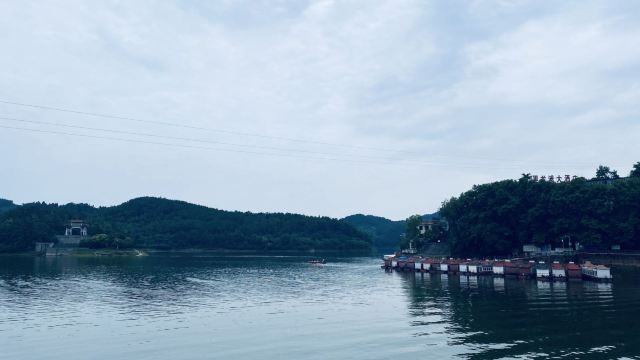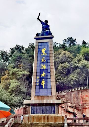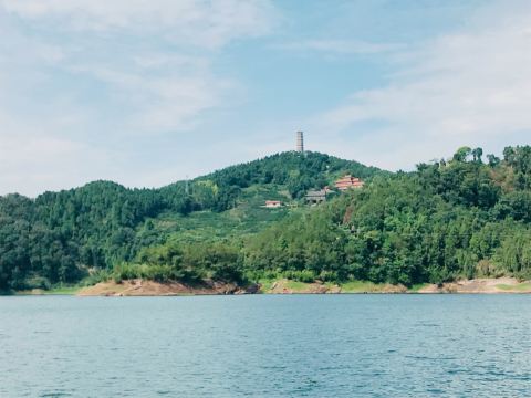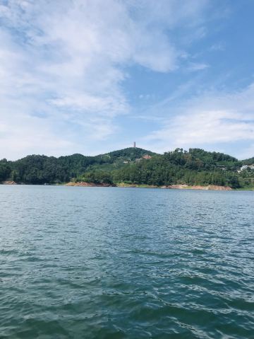 3.看点:(1)湖,这个水库挖的很大,是在原“黑龙潭”基础上扩建的。湖面波光粼粼,但没有水光接天,一个原因是因为本来Y字就不可能看起来像鄱阳湖或者洞庭湖,另一个原因是我是个老实人,不喜欢夸大“飞流直下三千尺”。传说黑龙滩有72个岛对应二郎神72般变化,为什么会和二郎神扯上关系,在之前游“泼水现字”说过了就不说了,船家说只有枯竭时候72个岛才能全部漏出,这是题外话。湖水碧波荡漾,掬起一捧清澈见底,近几年加大力度保护的成效果然明显,可以带个矿泉水瓶子装一瓶,这里是水源保护地了。这种保护的缺点在于,我本想坐个私人船,像在百丈湖那样,尽享湖水的清凉,但湖边农家乐全部没有这项服务了,惋惜。(2)报国寺,几年前第一次来的时候去过,上岛之后再走很有段距离才到,需要爬个不高的山。寺庙不大,有鸽子,一座塔矗立山巅,巍峨挺拔,但不能进去。可以找当地人坐过摩托爬山。(3)蟠龙岛,收费的小岛,照片里那个像shaB一样挥舞双手的喜感充气人之所在,也是游湖船必经之处。他们串通好带你过去,然后到另一端等你,收你25的门票。岛上以前是猴山(字数限制,游记见)