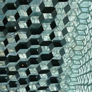 建筑的玻璃外型好比一个巨大的万花筒,上千块不规则的几何玻璃砖随着天空的颜色和季节的变化反射出令彩虹都相形见绌的万千颜色。