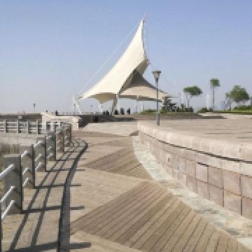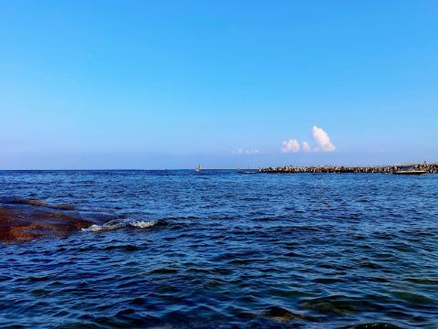 沿着海岸线漫步,脚下是宽阔的木栈道,两旁是大片的绿化带,种满了黑松和其他景观植物。海浪拍打着岸边的礁石,发出阵阵声响,仿佛在演奏一曲自然的乐章。远处的海面上,几艘帆船在海风中缓缓前行,构成了一幅宁静而美丽的画面。