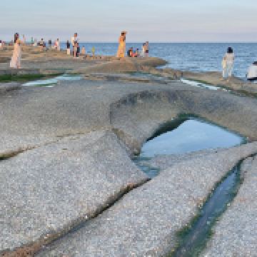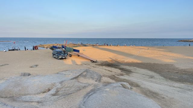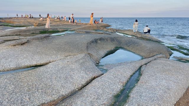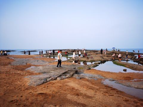 景区岸边是大片沙滩,不过这里的沙质比较粗,而且有很多黑色的礁石。是拍风光照的好地方,因此经常可以看到一些新人在这里拍婚纱照。