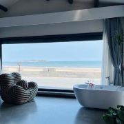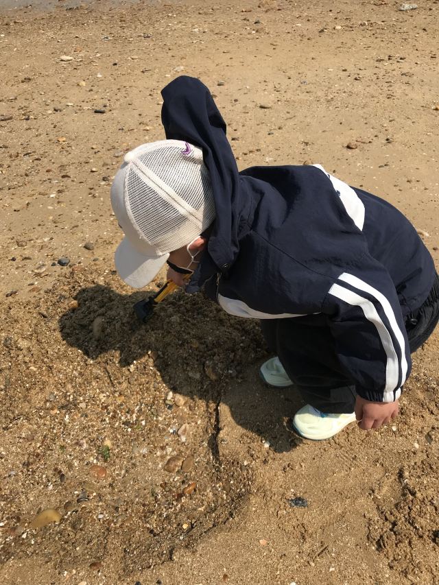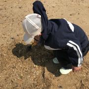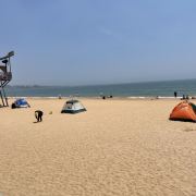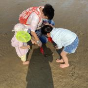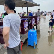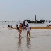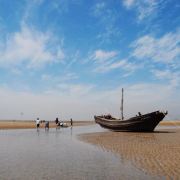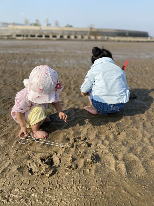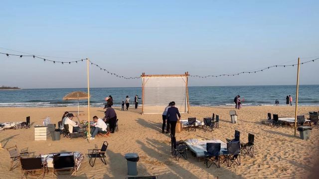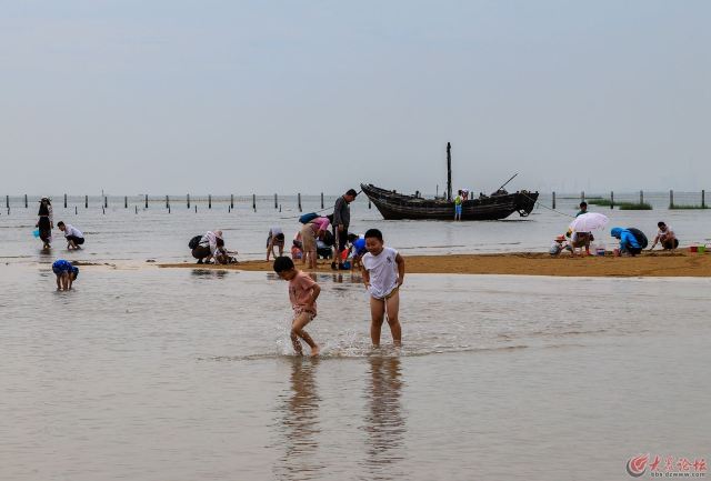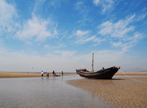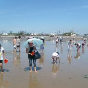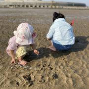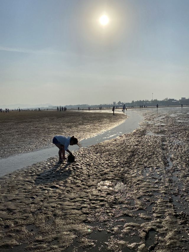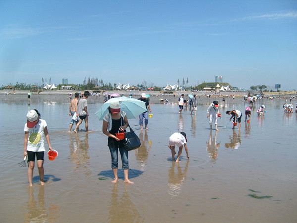 在刘家湾赶海园里,因为海水涨潮和退潮的速度都非常快,很多海生物在退潮的时候来不及回到海里去,就都留在了海滩上,游客们就可以趁着退潮间隙赶海。海滩上全是很软很细的泥沙,踩上去非常舒服。到处都是海贝、小螃蟹、寄居蟹,即使第一次赶海,也会满载而归的。