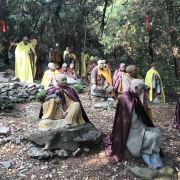 景区林木茂密,与佛来峰和飞来峰三峰鼎峙而又拱围相连。风景区里的一大看点就是定林寺,这座千年古刹也是山东省现存较古老的寺院之一,也就是刘勰故居,充满了浓厚的人文氛围。寺中游存活了3500多年的天下银树,参天而立,龙盘虎踞,值得一看。寺周围还有十二生肖园和五百罗汉阵。值得一提的是五百罗汉阵里的人物个个栩栩如生,惟妙惟肖,很是壮观。