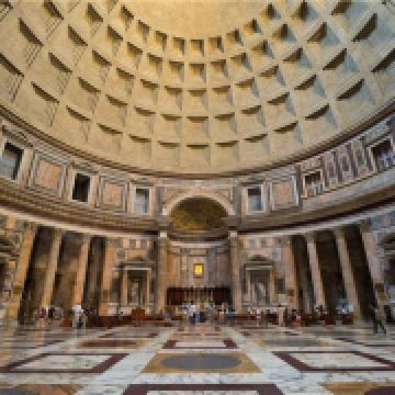 万神殿是古罗马精湛建筑技术的典范。它是一个宽度与高度相等的巨大圆柱体,上面覆盖着半圆形的屋顶。拉斐尔等许多著名艺术家就葬在这里,葬在这里的还有