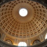主体建筑结构简洁明了,是一个宽度与高度相等的巨大圆柱体,上面覆盖着半圆形的穹顶。内部没有窗户,四周一圈围绕着诸神雕塑。顶部有一个直径8.9米的圆形大洞,是万神殿的采光点,光线从顶部泄下,并随着太阳位置的移动而改变光线的角度,给人一种神圣庄严的感觉。