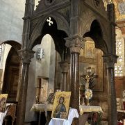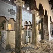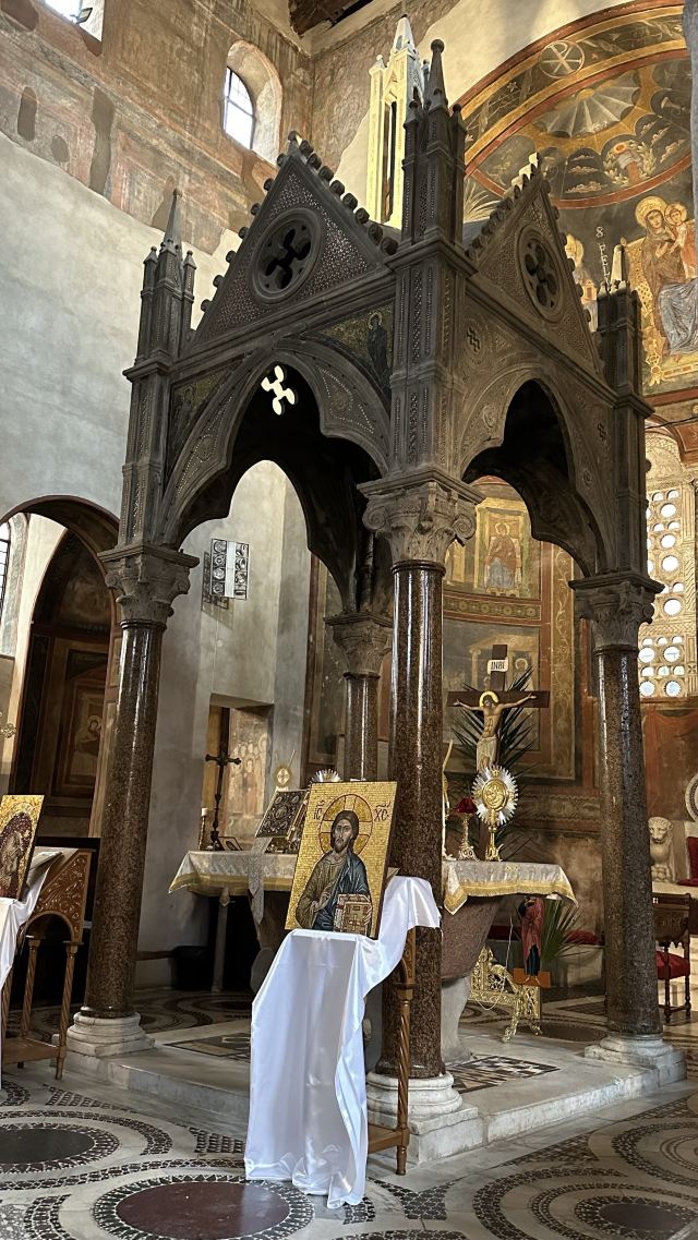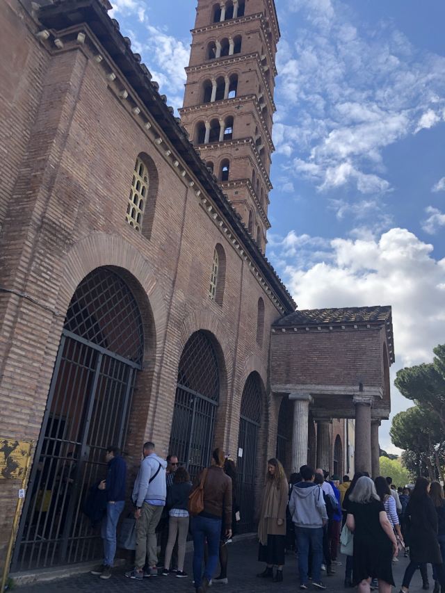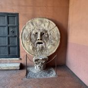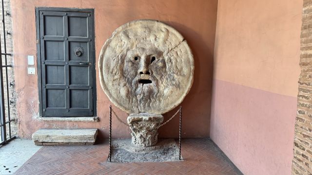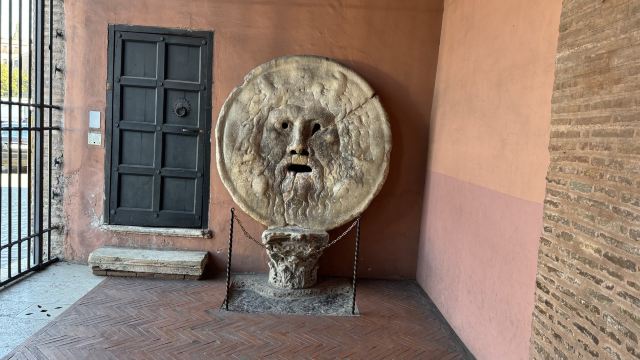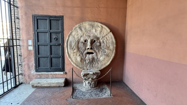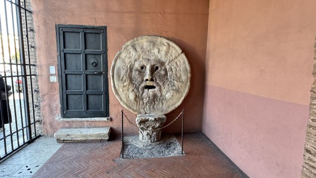 这是一只古罗马时期的井盖儿,1632年在教堂外墙边发现的,据说把手放在她的嘴里,如果说谎就没办法拔出来,在电影《罗马假日》里就是它吓坏了可爱的公主。教堂本身的建筑是在六世纪兴建的,以拜占庭风格的镶嵌画为装饰。