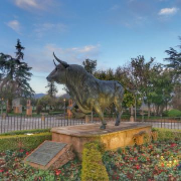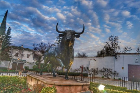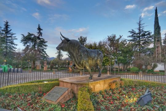 龙达斗牛场围墙外的醒目位置,专门树起了“龙达公牛”的雕像,一头骠肥体壮的黑色公牛,身体前倾、牛尾翘起、四蹄生风、牛角如刃…威猛至极。
