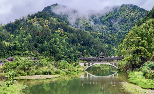 小丹江寨边小河绕寨而过,寨子依山而座,傍水而落,四面环山,青山竹林苍翠环抱村寨,周围原始森林层峦叠障,苗族风情浓郁古朴。