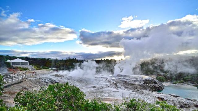 华卡雷瓦雷瓦地热保护区集温泉奇景于一身。区内烟雾弥漫,新西兰较大的间歇泉波胡图(Pohutu),泉水喷出高达30公尺,通常每天喷出20次,擎天水柱倾泻而出,蔚为奇观,成为罗托鲁瓦的地标。