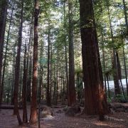 漫步红木树林,脚踩着红木木屑铺成的道路,就像是在走红地毯般,柔软而有弹性。细看红木树林,茁壮、纤细的树木各具特色,其中令人啧啧称奇的是那株二百余岁的红杉树,很粗壮的树杆,起码要四五个一米八的小伙子才能手拉手地将其围住。