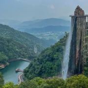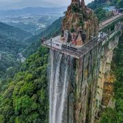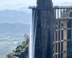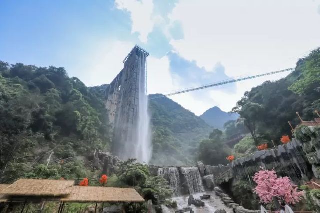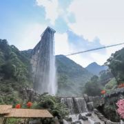 云上飞瀑瀑布出水口宽8米,从顶端直流而下,一泻到底,其落差达168米,相当于五十层楼的高度,从远望去,百米瀑布倾泻而下,颇为壮观,瀑布内安装有3台观光电梯,每台观光电梯可同时容纳13人,是国内罕见的瀑布与电梯组合游玩项目,瀑布顶部设有80米长的观光平台供游客观景,站在观光平台上,可以直接俯瞰谷底的无限美景。