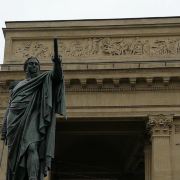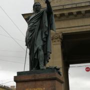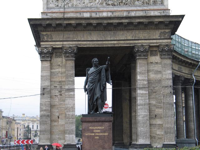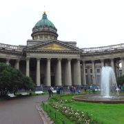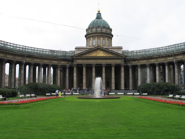 喀山主教座堂位于圣彼得堡,是由俄罗斯建筑师沃罗尼欣设计的。半圆型的柱廊由94根圆柱组成面向大街环抱广场,柱廊前面矗立着纪念碑,教堂里有库图佐夫墓和1812年打败拿破仑的胜利品。