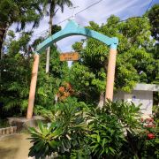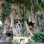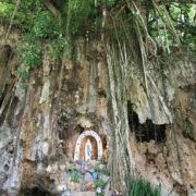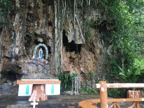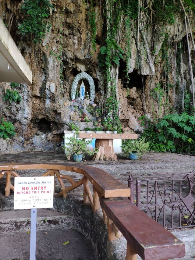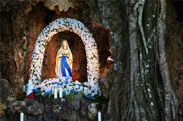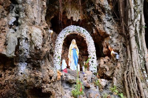 地处半山腰间的圣母洞周围被大树覆盖,入口非常简单。门口处矗立着一座钟。走进内部,眼前是巨大的榕树,枝蔓从上垂直下来。周边还有芭蕉及各种花卉。