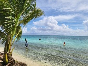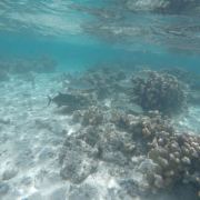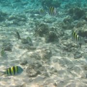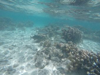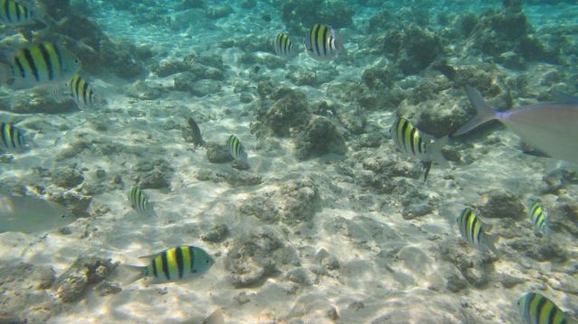 岛基本分三个区域,码头一侧的区域,也就是有救生员的地方。这里适合初次浮潜的人,人比较多,这边鱼不是特别多。从码头一侧向北走,是一大片的白色沙滩,这里树荫下排放着很多免费的躺椅供游人休息。绕着岛走到另一侧,也是浮潜的地方,这里水并不深,多也就没腰。水清鱼多珊瑚漂亮,不过需要注意,这边珊瑚都是硬骨,千万别站在珊瑚上,很容易滑倒受伤。