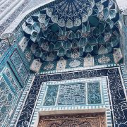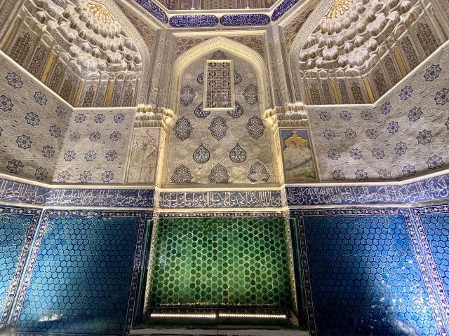建筑以青金石蓝配上绿松石色琉璃瓷砖闻名,马赛克拼出几何图案,阿拉伯铭文和植物纹样,被称作蓝色瓷砖博物馆。