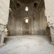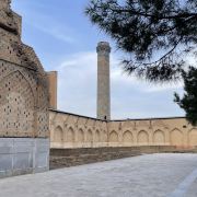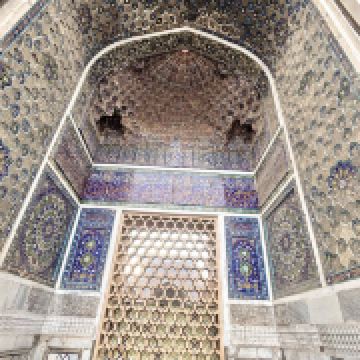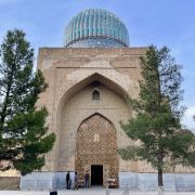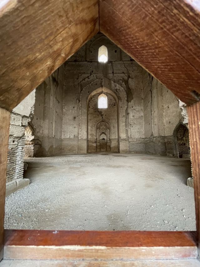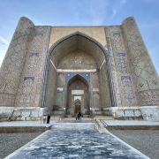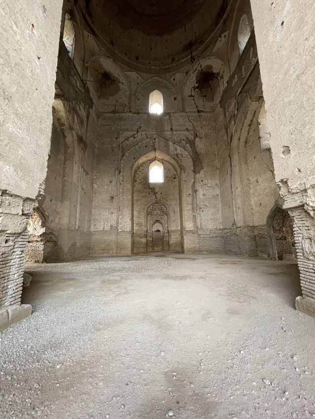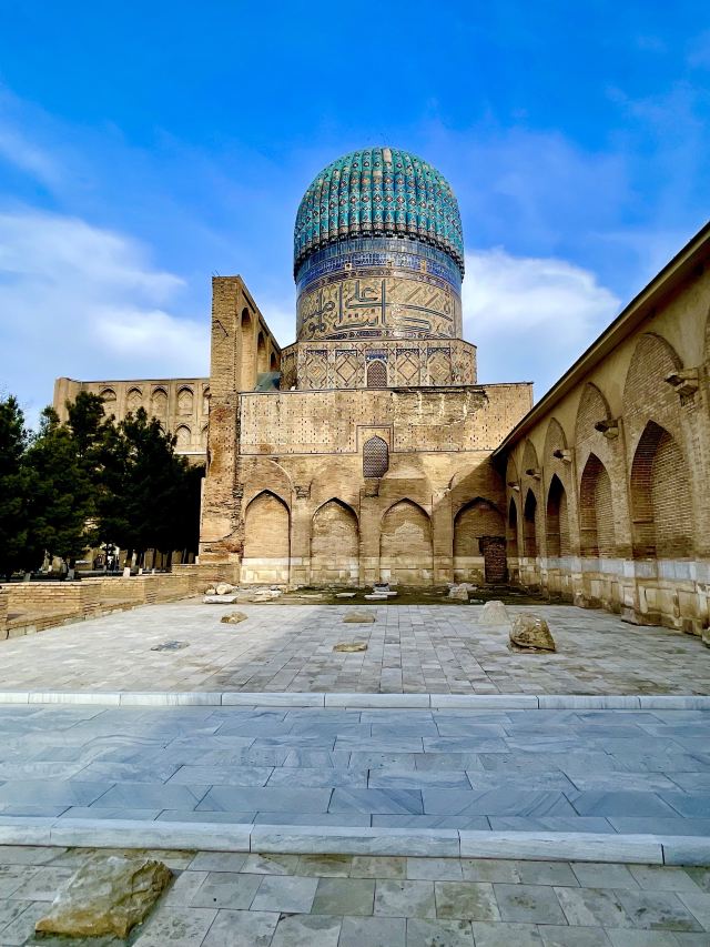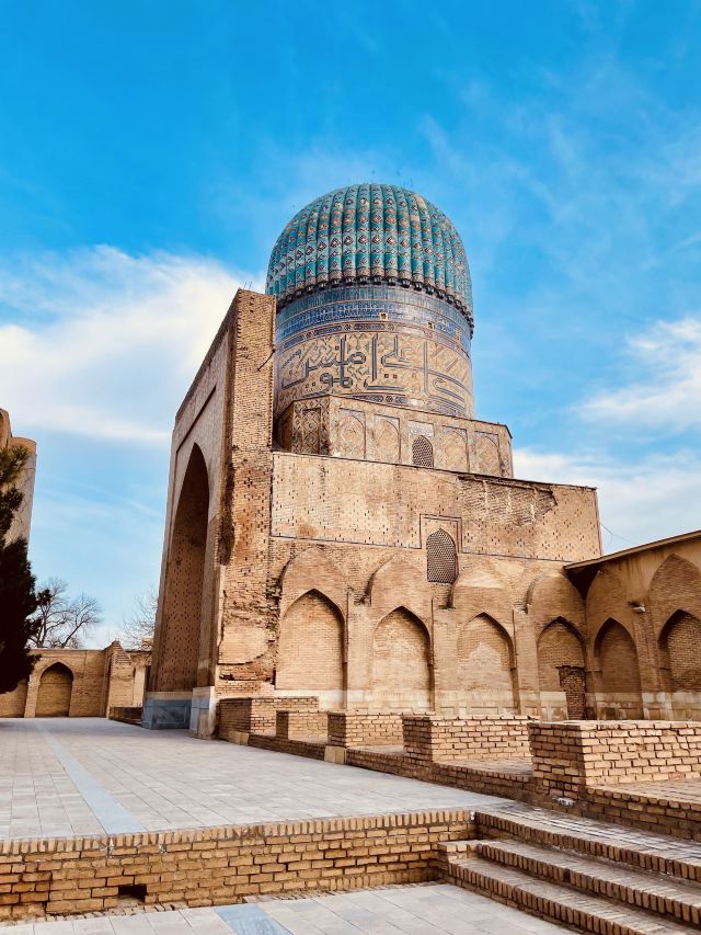 在15 世纪,它是伊斯兰世界最大、最宏伟的清真寺之一。它被认为是帖木儿文艺复兴的杰作。到 20 世纪中叶,只有宏伟的废墟仍然幸存,但清真寺的大部分在苏联时期得到了修复。
