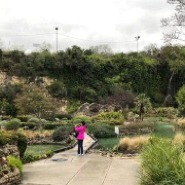 精致的日本园林和建筑,石头垒砌的步道和墙,漂亮的绿色水池,里面游着大大小小的锦鲤和不高的瀑布点缀着小花园,随处可见的棕榈树和竹子,体验在美国异域中的亚洲文化。