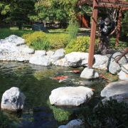 这是一个日式花园,园内不仅有池塘、石桥、瀑布和盆景等景观,还种植着大片的樱花树,非常美丽。
