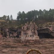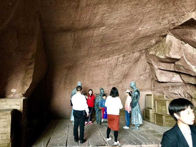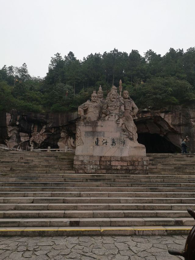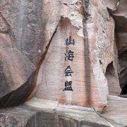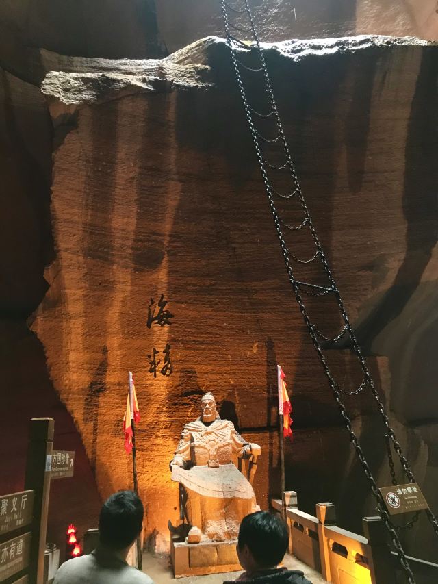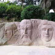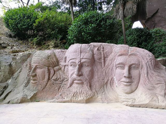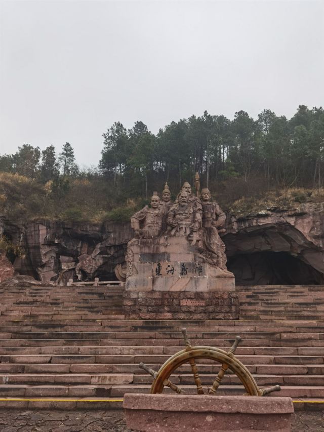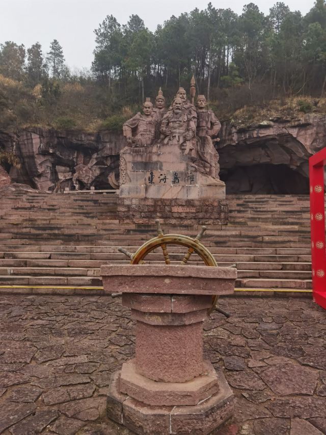 景区大门的正前方有一组岩石群雕,孙恩、卢循、方国珍、王直、郑芝龙五位海盗枭雄栩栩如生,他们都是中国海盗史上的精英人物。映衬这些精英的原是一片青山,后经岛民自上而下竖井洞式的采石,加上后人在古石岩内爆破取石,山体被削平,古代手工开凿与现代打眼放炮的采石遗痕,交织形成眼前奇特的山水景观。塑像一侧的洞窟岩壁上题刻着一段标语:“道不行,乘槎浮于海;人之患,束带立于朝”。大意是天下无道、政治腐败就起义下海;冠带为官、效忠昏君是人生之不幸。在当时的中国封建社会,特别是明朝之后,官府海禁和迫害,将渔农工商逼上了绝路,陆地上的草莽英雄和海洋中的东海枭雄在山海间会盟,前仆后继,在东海历史上演出了一次又一次的慷慨悲歌。
