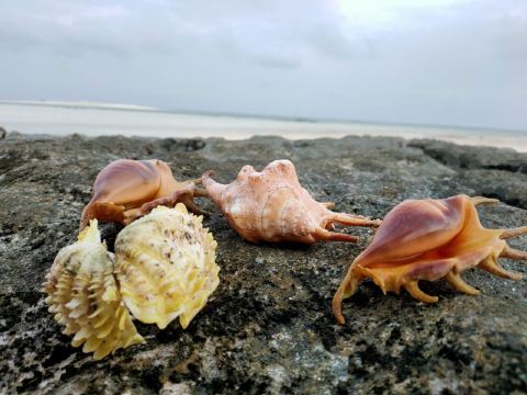 西沙近海岸的海底有很多海胆、海螺、螃蟹等,我们在浮潜的同时还可以去“寻宝”,几十分钟下来,就能收获满满的加餐菜。这里是不愁吃的。