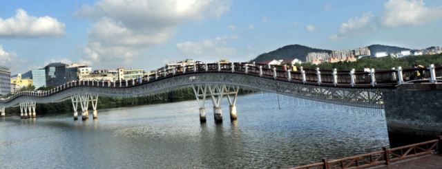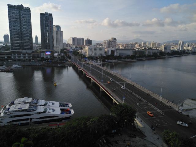 【攻略】三亚桥周边景观:桥是东西方向的,桥下是游艇码头,一直延伸到对岸鹿回头景区山脚下,足足有二百条以上停放在这里。桥南对面就是【鹿回头景区】,桥南右边是鸿洲广场,景观楼3栋是鸿洲天玺海景公寓。桥南左边是鸿洲时代广场,富有南方风情的“时代风情酒吧街”靠着桥畔。对面是三亚市委大楼。桥北左边是有名的河西路,三亚第一市场距离100多米。桥北河西河东都有亲水平台,河西的亲水平台向北一直延伸到情人桥与新风桥。足足4、1公里,是漫步休闲的好地方,夜晚情人桥旁边特别热闹。