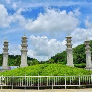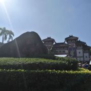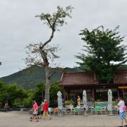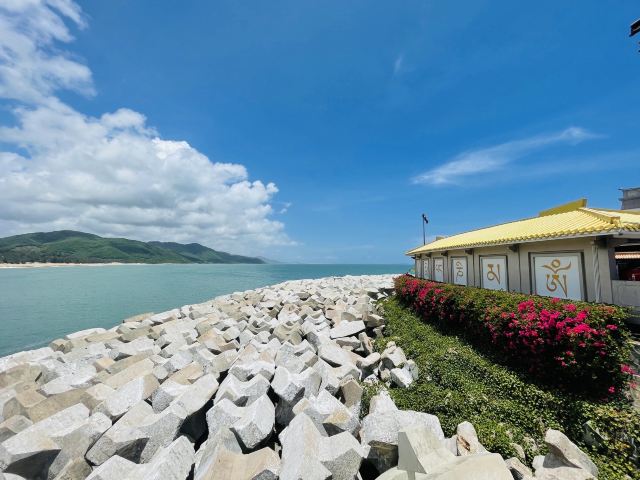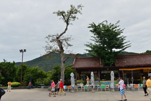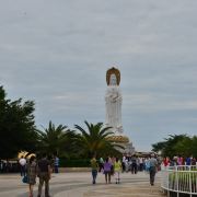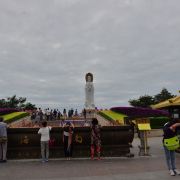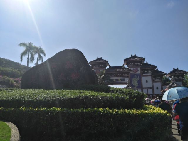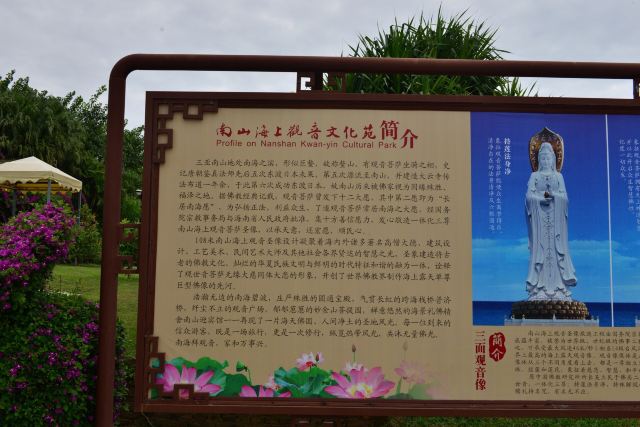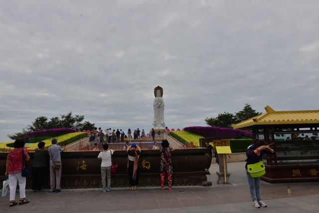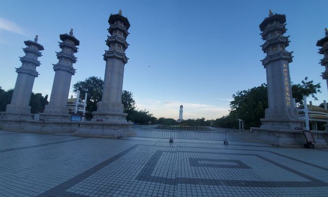 大门外的“不二”和大门内的“一实”系已故著名书法家顾廷龙老先生94岁时所书。“一实”是“不二”的对应。从此往前走约100米就是电瓶车站。这里是南山文化旅游区的入口,是必经之地,有兴趣的还是跟着导游听听讲解,佛教的文化博大精深啊,光看看建筑也不过是走马观花。往往在此乘坐电瓶车第一站就到了海上观音,如果只是纯粹看海上观音的可以步行过去,因为真的很近,如果想转转其他景点的,则一定要坐电瓶车,景区面积较大,而且非常晒。
