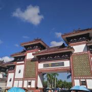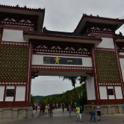 进入海南三亚南山文化旅游区,首先看到的是大门的景观,高大的大门坊(我国历史上南北朝时期的建筑风格),门楣上大书‘不二'两字,因此这座大门被称为‘不二法门’。这是应了佛教理论中的一个基本概念,(见不二法门简介照片)‘不二’也称‘无二’‘离两端’。