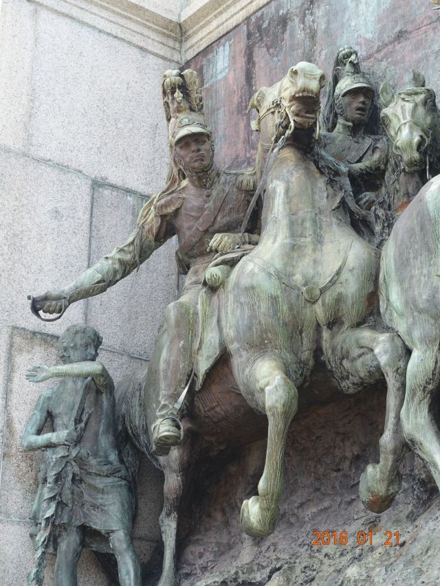 纪念碑的底座为一个巨大的心形造型,台阶层层递减,拾级而上间,一种雄性的张力扑面而来。纪念碑顶端是一组人物群雕,表现的是佩德罗一世向里约热内卢进军的情景,他们神情庄重严肃,气势雄浑。大理石的基座正面是一组大型青铜浮雕,描绘着着佩德罗一世宣布巴西脱离葡萄牙统治而独立的情形,细细品味,内感受到这里的人物肢体形态所带一种喜庆与自豪。基座四周还刻画着着独立者群像,站在纪念碑下可欣赏纪念碑到这些浮雕。纪念碑地下室存放着佩德罗国王和王后的灵柩。纪念碑的圣火终年不熄,与迎风飘扬的巴西旗帜遥相呼应,引人深思。
