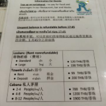 更衣处很干净,男女分开。寄存柜是一起的,小的120泰铢不够用,两人分一个190泰铢的长柜刚好。更衣室提供淋浴和吹风机,但是大毛巾99泰铢租借费,建议还是自己带,还有拖鞋也请带好,每个项目门口都有鞋柜可以放的。