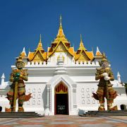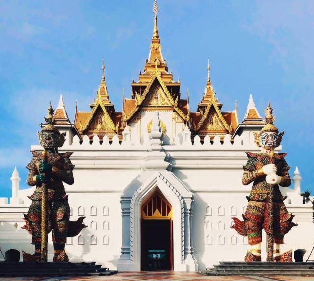 2、大门的守护神是“罗波那”和“沙哈斯德查”夜叉神,日夜守护着暹罗。其实大家在泰国许多景点,包括机场内都能看到这两尊守护神。据说这里的两尊神像,也是目前全世界最大的“罗波那”和“沙哈斯德查”。