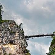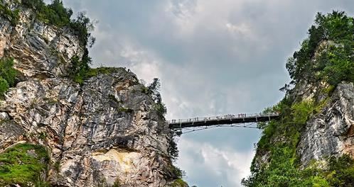 玛利亚桥位于德国巴伐利亚州,横跨波拉赫峡谷,距离新天鹅堡仅数百米,是欣赏城堡全景的好地点。桥梁建于19世纪,起初为木制结构,后改为钢铁桥,长约90米,悬于高空,提供壮丽的自然景观。从桥上可以俯瞰新天鹅堡的全貌,尤其在清晨或黄昏时分,城堡在阳光映衬下显得格外迷人。桥的另一侧是阿尔卑斯山脉,山峰与森林交织,景色宜人。游客常在此驻足拍照,捕捉城堡与自然的结合。