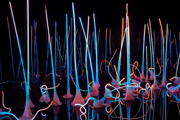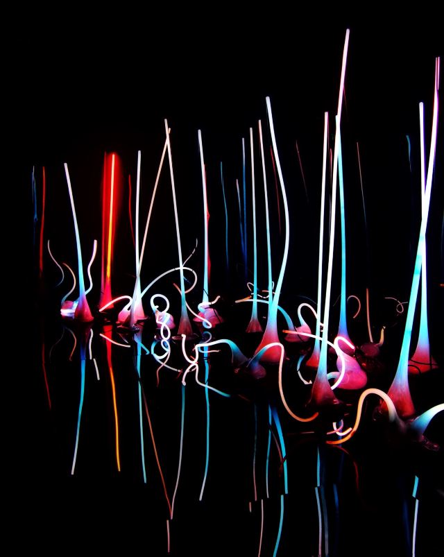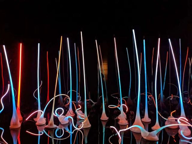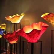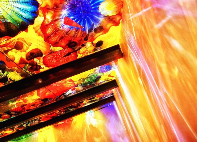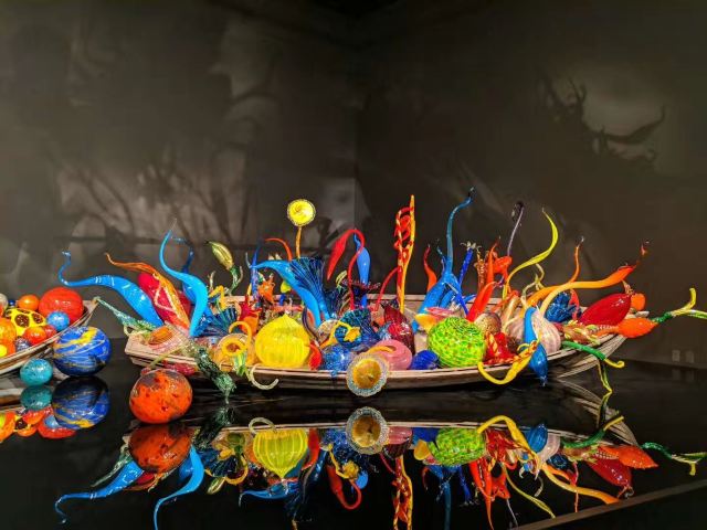 奇胡利玻璃艺术园的展览分为室内区和室外区。室内展品多为奇胡利大师多年间盛行不衰的作品,色彩斑斓的玻璃制品与室内的灯光搭配,仿若被赋予了鲜活的生命力;室外则以一个巨大的玻璃展厅为主,展厅里陈列着一个100英尺长由1400片玻璃组成的悬浮雕塑,随着自然光的变化而变幻多姿,美的惊心动魄。