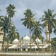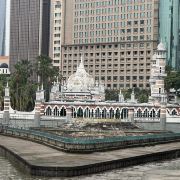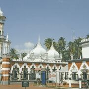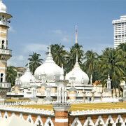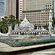 占美清真寺屹立于吉隆坡的发源地哥巴河和巴生河交汇之处,是当年锡矿工人首先载吉隆坡登陆的地点。这座红砖建筑物被棕榈树环绕,建于1909年,云石地板闪闪生光,气势不凡。