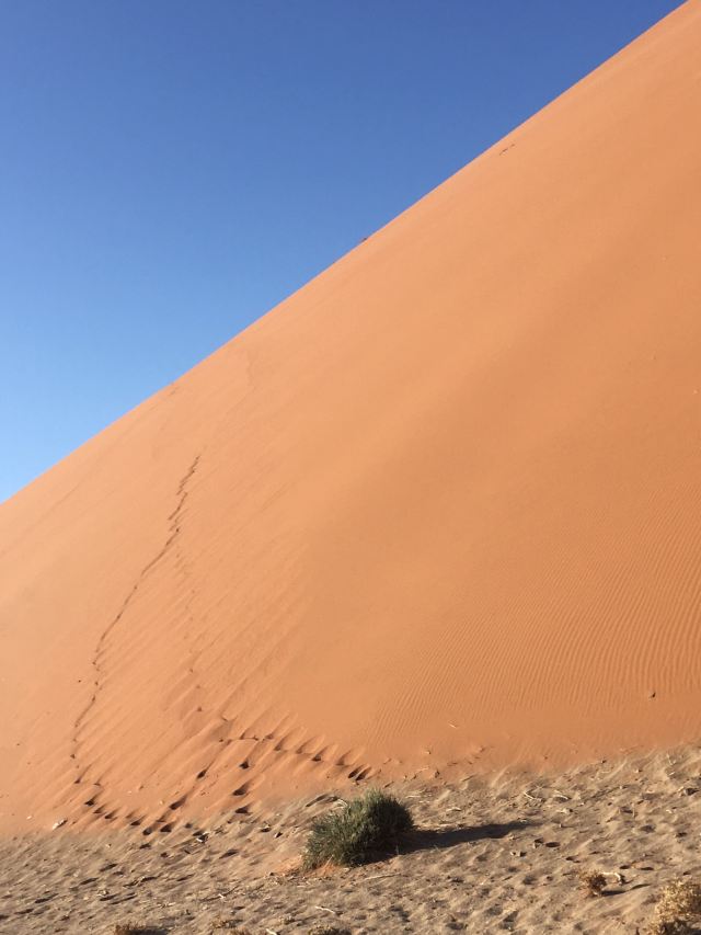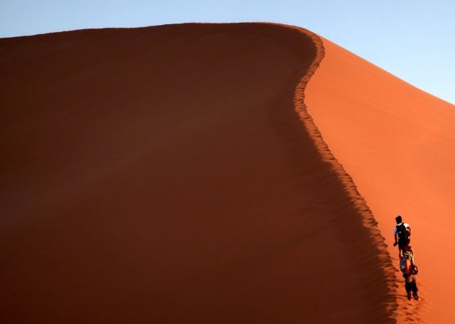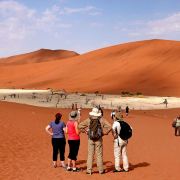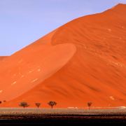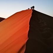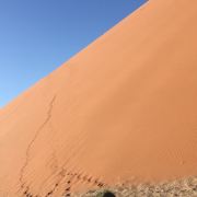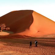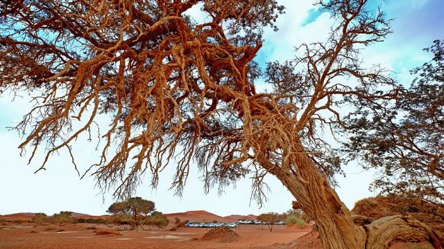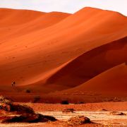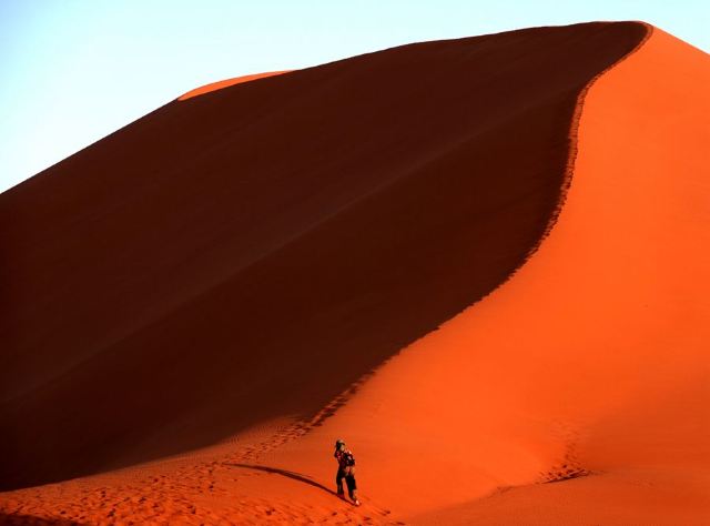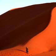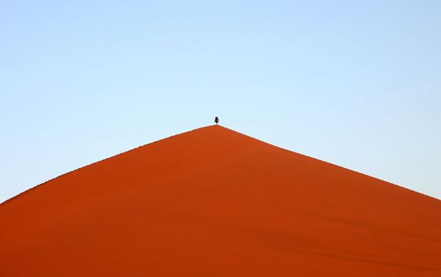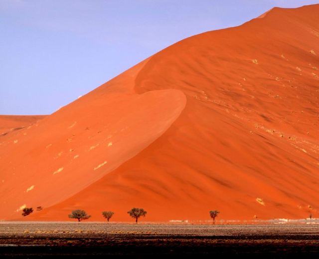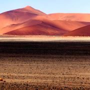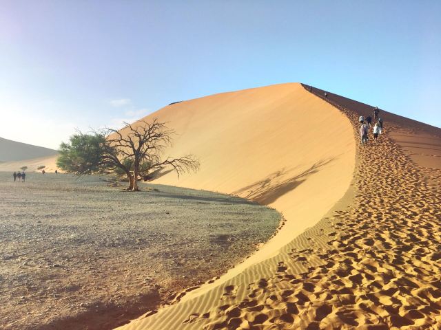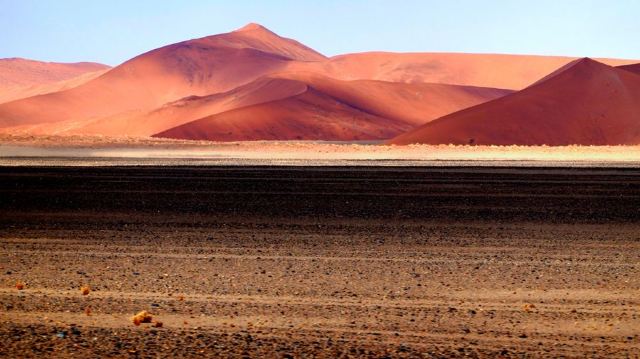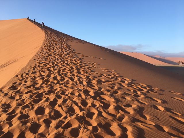 45号沙丘以其壮观的红色沙丘闻名于世,其独特的红色来源于沙粒中富含的氧化铁,这种颜色在清晨和傍晚的阳光下尤为鲜艳夺目。阳光的角度和强度使沙丘的色彩和阴影变化多端,为摄影爱好者提供了拍摄机会。攀登45号沙丘是一次令人难忘的体验,游客可以俯瞰整个沙漠的壮丽景色,感受到大自然的恢宏与静谧。沙丘顶部的视野开阔,尤其是在日出或日落时分,整个沙漠被染上金色的光辉,景色美不胜收。该沙丘不仅是自然奇观,也是人们探索自然、挑战自我的理想之地。游客在这里不仅可以体验到攀登沙丘的乐趣,还能感受到纳米布沙漠的神秘与壮美。