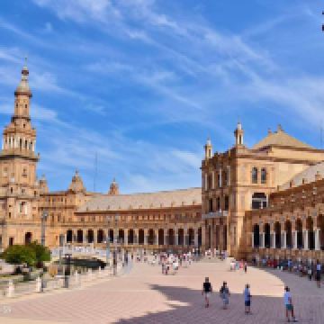 塞维利亚的西班牙广场位于城南环境幽静、气氛清新的玛丽亚・路易莎公园中,其新月形的古典建筑在绿地簇拥之中别具典雅姿态,是很受塞维利亚市民欢迎的休憩场所。