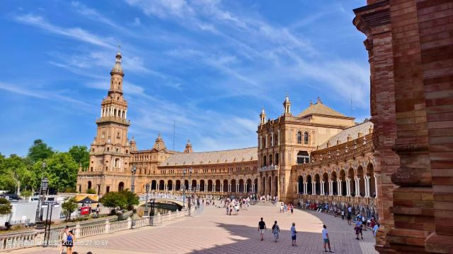 塞维利亚西班牙广场是西班牙最壮观的建筑群之一,也是1929年伊比利亚-美洲博览会的遗产。 设计由建筑师阿尼巴尔·冈萨雷斯主导,其风格融合了新文艺复兴、摩尔复兴和装饰艺术元素,红砖、彩瓷瓷砖和锻铁工艺凸显安达卢西亚传统。半圆形布局:直径200米,缺口面向玛丽亚·路易莎公园,象征西班牙对前殖民地的拥抱。护城河与桥梁:人工河上四座彩瓷桥代表西班牙四大古王国(卡斯蒂利亚、莱昂、阿拉贡、纳瓦拉)。