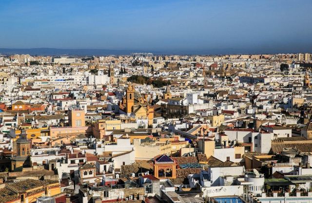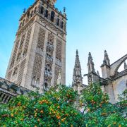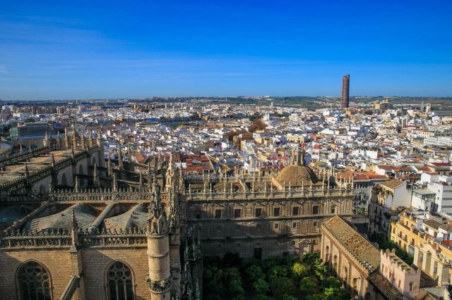 吉拉尔达塔是塞维利亚的地标,不论在城市的哪个位置都能看到这座98米左右高的建筑。此塔由伊斯兰教徒阿莫阿德家族于12世纪末主持修建,伊斯兰风格浓郁,从塔下仰视觉得塔尖很小,其实那是高4米,重1288公斤的青铜神像,据说在风中它还会来回转动,塔顶28个大钟至今仍能用优美的音色为塞维利亚居民报时。