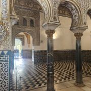 El Real Alcázar最为打动人心的点睛之笔莫过于佩德罗宫殿(Palacio de Don Pedro)。后人因为对佩德罗一世的感激而创造了这里,成就了塞维利亚最为让人赞叹的特色建筑。这座宫殿的中心叫做少女园(Patia de las Dondellas),四周环绕着美丽的拱门,装饰着精美而雅致的雕刻和瓷砖。