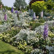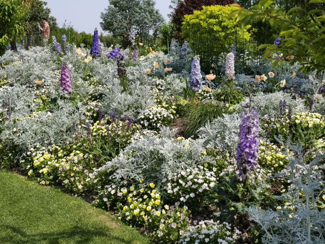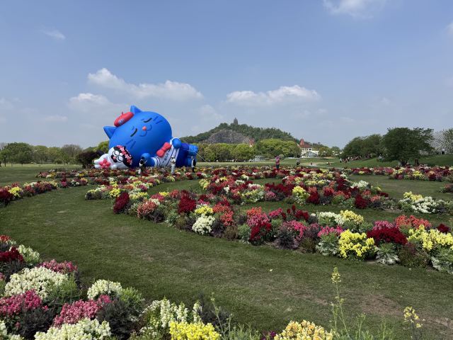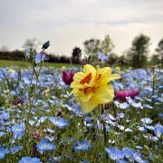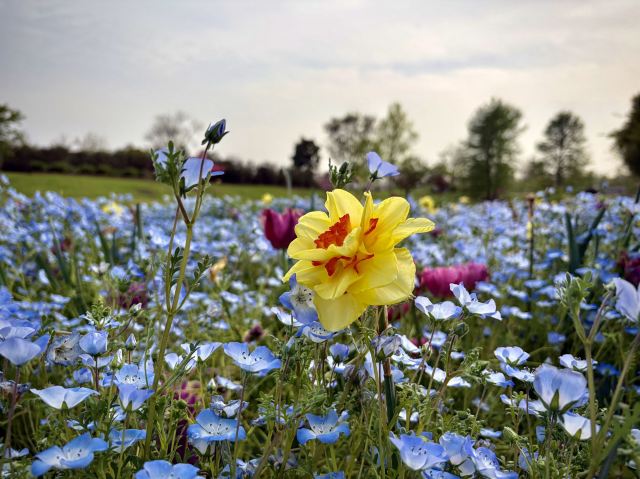 3-4月各色洋水仙与风信子、葡萄风信子、朱顶红、郁金香等花卉混合播种,各色春花次第盛开,形成花开不断的盛景。
