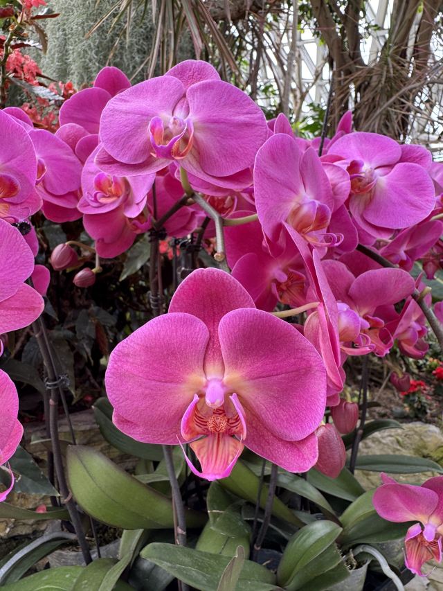 展览温室位于园区的东北角,由热带花果馆、沙生植物馆和上海辰山植物园-珍奇植物馆三个温室馆组成,内部有瀑布、山洞装饰。馆内有银色的小叶子做成的游览路线指示箭头,顺着箭头游览即可。热带花果馆种植着蝴蝶兰、天堂鸟(鹤望兰)、叶柄底部可存好几斤水的旅人蕉、棕榈等植物。沙生植物馆有各式各样的仙人掌,有的形状细长像黄瓜,有的矮矮圆圆像西瓜,还有叶子肉肉的各种肉类植物。在上海辰山植物园-珍奇植物馆你能看到自然界生存与进化过程中形成的珍稀奇特植物,比如食虫植物、苏铁类、蕨类植物等。