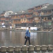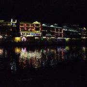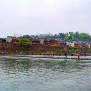 从跳岩中间来眺望沱江,可以欣赏到古城美景,跳岩中段是拍摄沱江美景的取景点,等同于站在了沱江的中心,可将两岸的吊脚楼、对面的虹桥风雨楼,和来往的小船都收入镜头内,所以这里可以说是凤凰古城颇受欢迎的摄影点之一。对于普通游客来说,到了古城,也必要走一走跳岩,听脚边沱江之水流淌而过,才不枉来一趟凤凰古城。