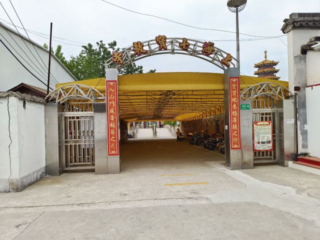 今天的七宝寺乃移址重建于2002年,汉唐建筑风格,朴素大方,庄严肃穆,总体上分寺、园两部分,占地43亩。有教寺桥、正山门、钟鼓楼、天王殿、大雄宝殿、经堂、法堂、藏经楼、六十星宿长廊、宝塔。寺院内东有牡丹花园和聚宝莲池。牡丹花园有牡丹亭。聚宝莲池汇聚了镇寺六宝铸铜雕塑,飞来佛铸铜佛像现在飞来佛殿里供奉。聚宝莲池周围设有画廊和诗廊,美其名曰“古风长廊”。